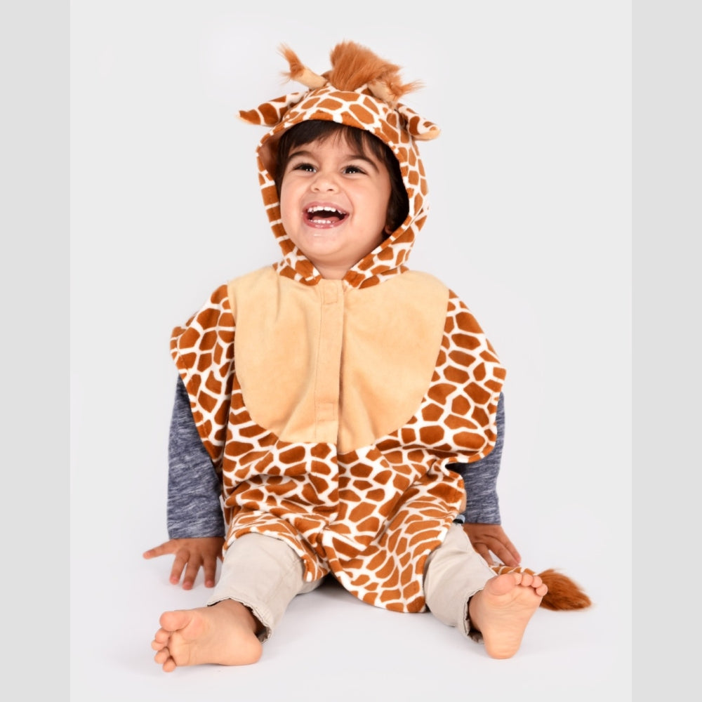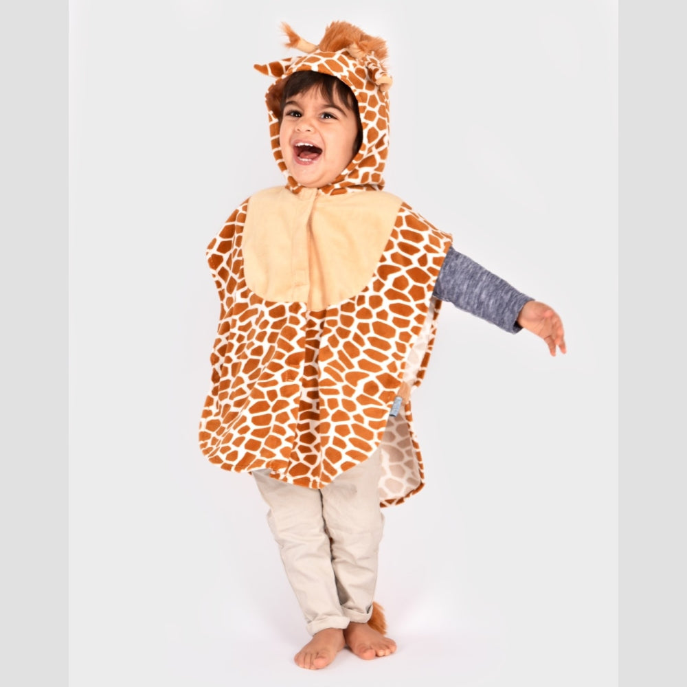 Delightful mini cape features a cute giraffe design that will capture the little one’s imagination. Just like our other mini capes, the Giraffe Cape has a Velcro closure at the front and elastic bands on the sides for easy dressing and undressing. This also makes it easier to play and frolic in. The cape has ears on the hood and tail on the back. Faux fur is on both the hood and the end of the tail. The giraffe cape offers hours of playtime fun.