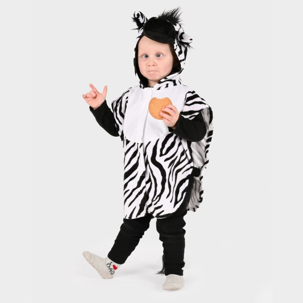 Adorable Zebra cape costume for the little ones. Just like our other mini capes, the Zebra Cape has a Velcro closure at the front and elastic bands on the sides for easy dressing and undressing. This also makes it easier to play and frolic in. The cape has ears on the hood, zebra nose and tail on the back. Faux fur is used as the mane. A favorite with little ones!