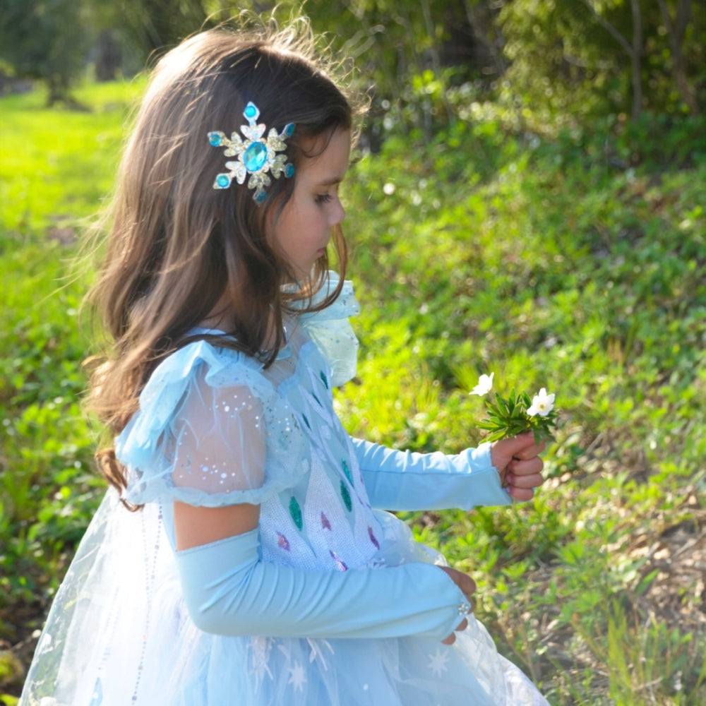 Princess dress in the Frozen blue colour so popular with young princesses. The captivating appeal of the soft blue and sparkle evokes the magical world of the Ice Princess.