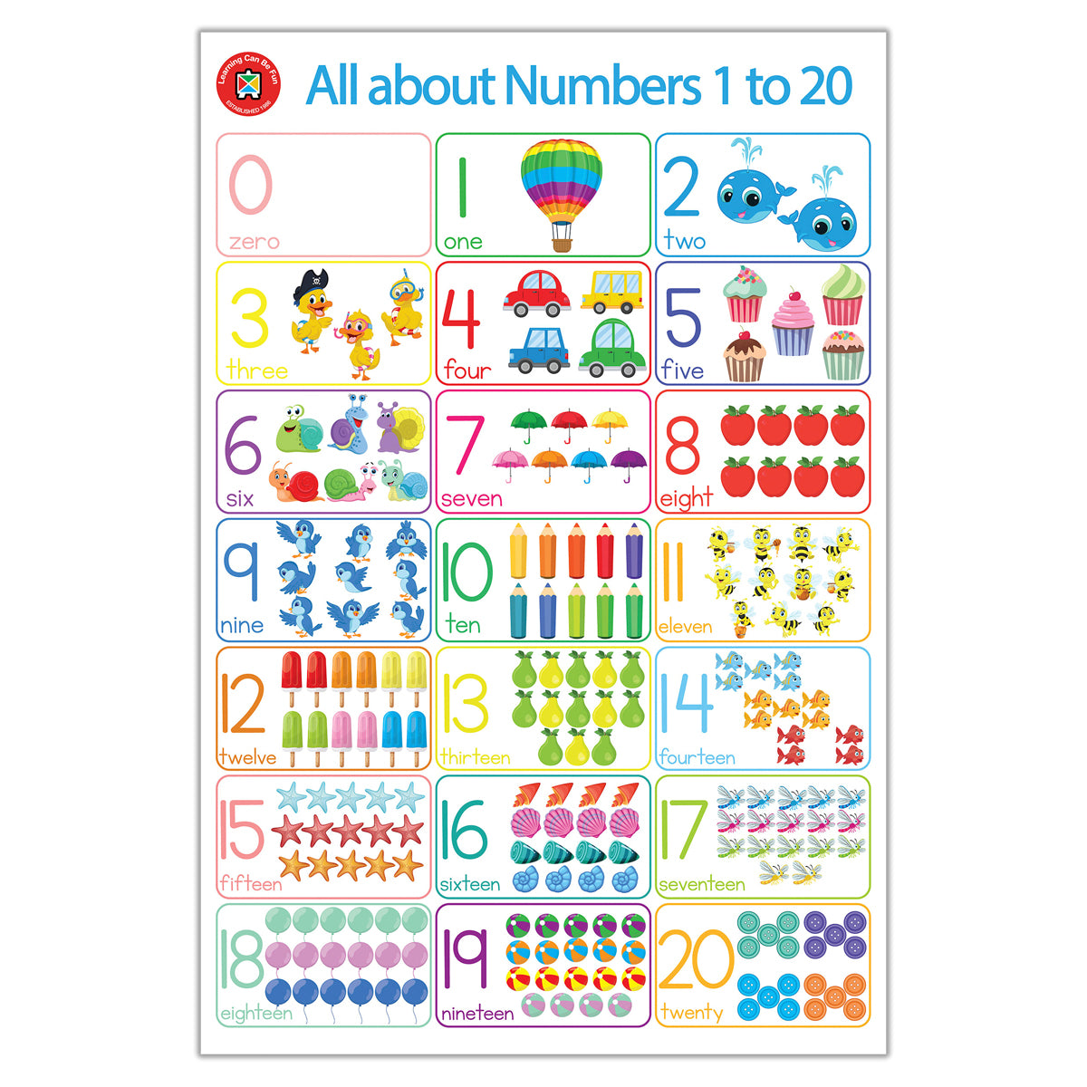 Early Learning Poster Box Set includes 1 of each of the following posters: All about Colours, All about Emotions, All about the Alphabet and All about Numbers 1 to 20.