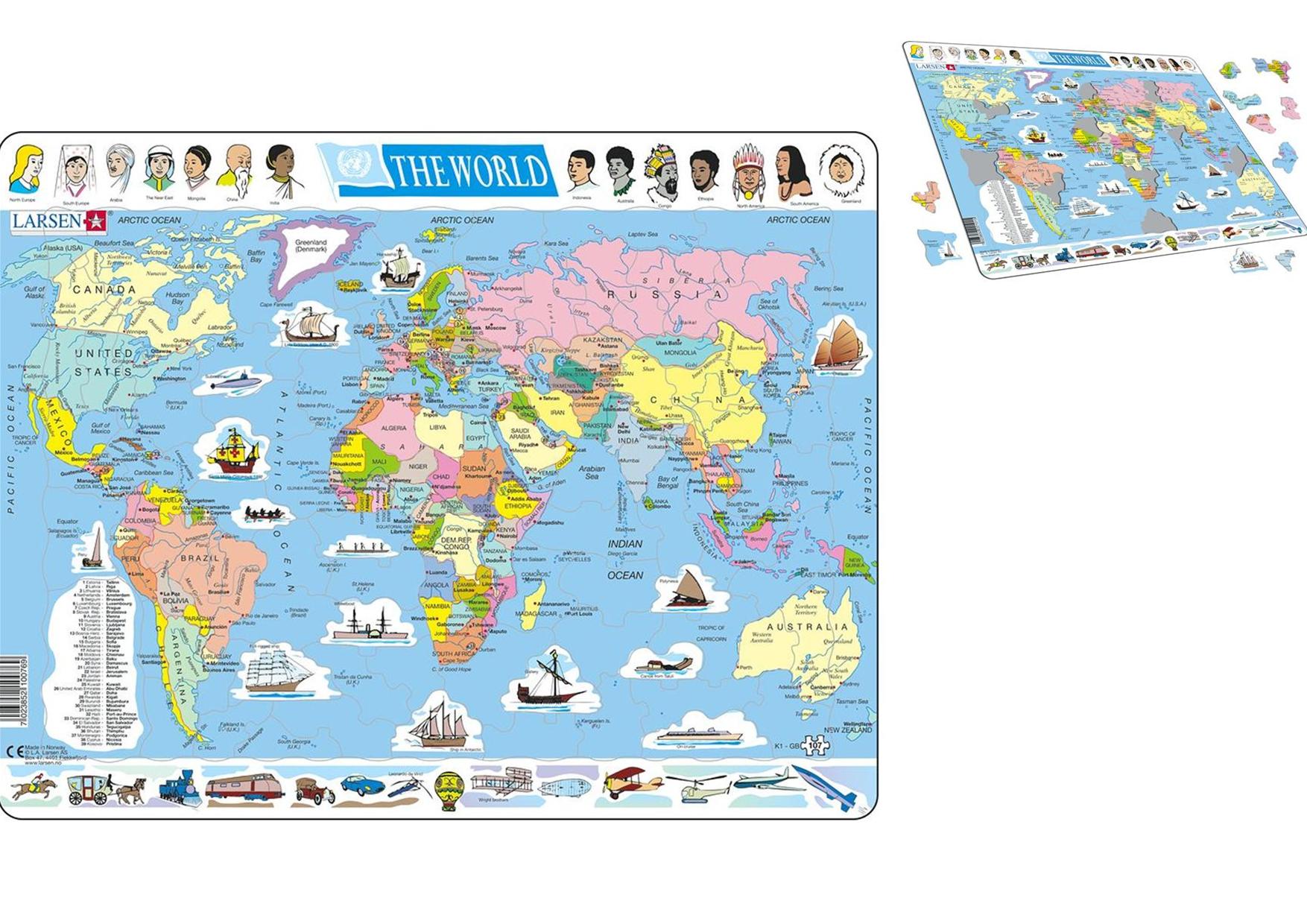 Larsen jigsaws are high quality tray puzzles. They are manufactured in Norway from re-cycled cardboard. The pieces are very sturdy and 2.5mm thick. The Political Map of the World Puzzle consists of 107 pieces which are all cut along borders and coastlines. This puzzle includes countries, capitals, and continents from around the world. Decorated around the frame of the puzzle, you'll find various means of transport including cars, horse carts, helicopters, planes, boats, ferries, ships, trains, and coaches. You'll also find people, both male and female of various nationalities.